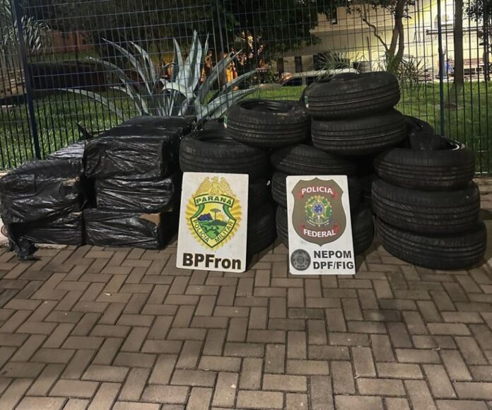 Foz do Iguaçu/PR. Uma ação conjunta entre a Polícia Federal e a Polícia Militar resultou na apreensão de, aproximadamente, 110 pneus e de 5 mil maços de cigarros contrabandeados do Paraguai, na quarta-feira (4/3), em Foz do Iguaçu.