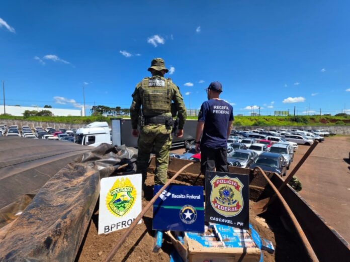 Cascavel/PR. Nesta segunda-feira (19/1), a Polícia Federal, em conjunto com a Receita Federal, o Batalhão de Polícia de Fronteira e o Batalhão de Polícia Militar de Operações Aéreas do Paraná, apreenderam um caminhão carregado com cigarros estrangeiros. A ação ocorreu durante fiscalização na BR-163, no trecho entre os municípios de Santa Teresa do Oeste e Lindoeste/PR.