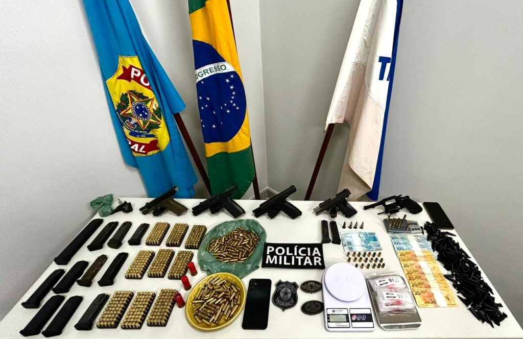 Foram cumpridos mandados de prisão, busca e apreensão expedidos pela Justiça. Durante as diligências, foram apreendidas armas de fogo, munições e substâncias entorpecentes.