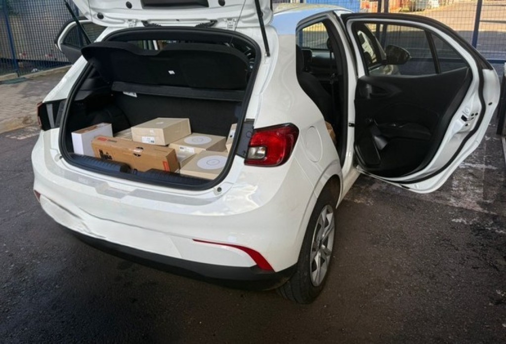 O acompanhamento levou os policiais até uma residência, onde foi localizado um veículo carregado com diversos eletrônicos provenientes do exterior, sem a devida comprovação fiscal.
