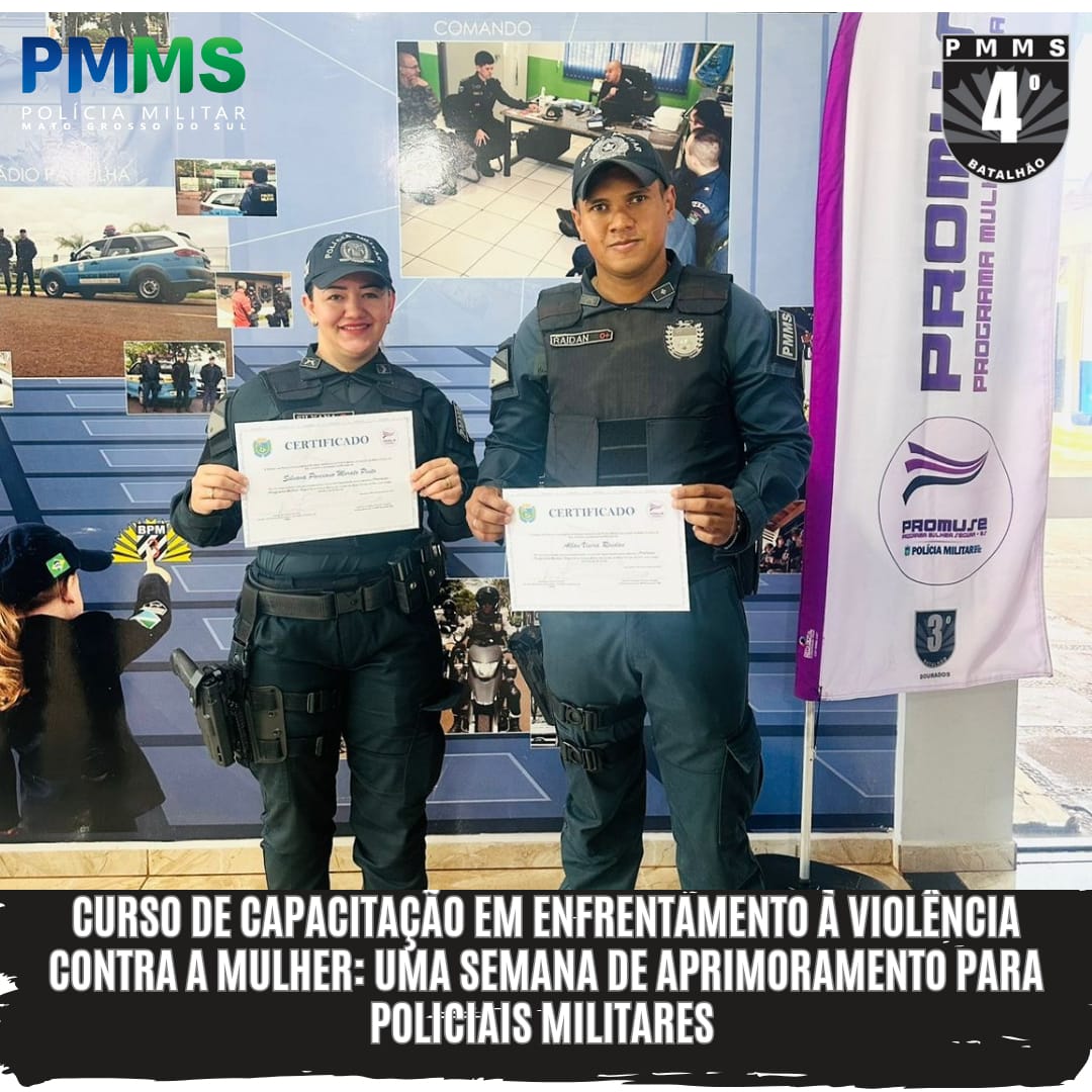 Entre os dias 24 e 28 de junho de 2024, dois Policiais Militares do 4º Batalhão de Polícia Militar de Ponta Porã, o 2º Tenente Raidan e a Cabo Silvana, participaram do Curso de Capacitação em Enfrentamento à Violência contra a Mulher, realizado em Dourados. A iniciativa, promovida pela Polícia Militar do Mato Grosso do Sul, em parceria com o 3º Batalhão de Polícia Militar e a 9ª Companhia Independente de Polícia Militar, ambos de Dourados, visou aprimorar o conhecimento e as habilidades dos policiais na luta contra a violência doméstica e familiar.