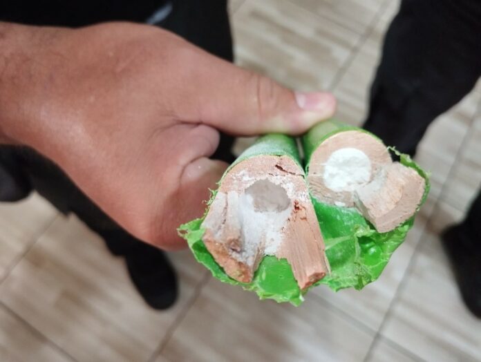 A droga foi detectada durante a inspeção de rotina, quando os objetos passaram pelo aparelho de raio-X de bagagem. Após a análise detalhada, os policiais encontraram 105 gramas de cocaína ocultados no interior dos cabos.