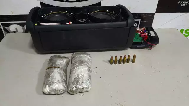 Durante a vistoria no veículo, os policiais encontraram uma caixa de som portátil nova, trazida do Paraguai. Dentro do equipamento estavam escondidos dois pacotes de maconha, totalizando cerca de 400 gramas, além de seis cartuchos de calibre .38.