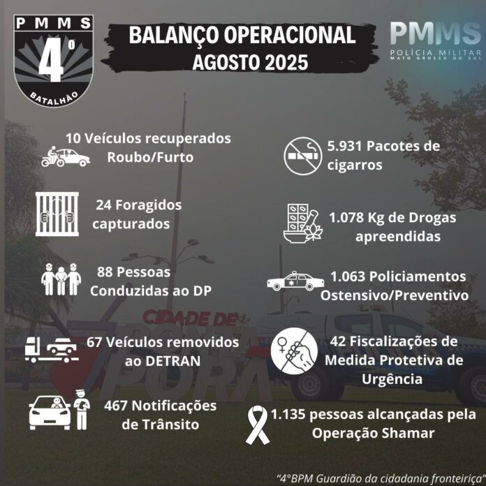 O 4° Batalhão de Polícia Militar divulgou nesta quinta-feira o balanço das ações realizadas durante o mês de agosto de 2025. Os números refletem a intensidade do trabalho policial na região de fronteira e o compromisso da corporação com a segurança pública.