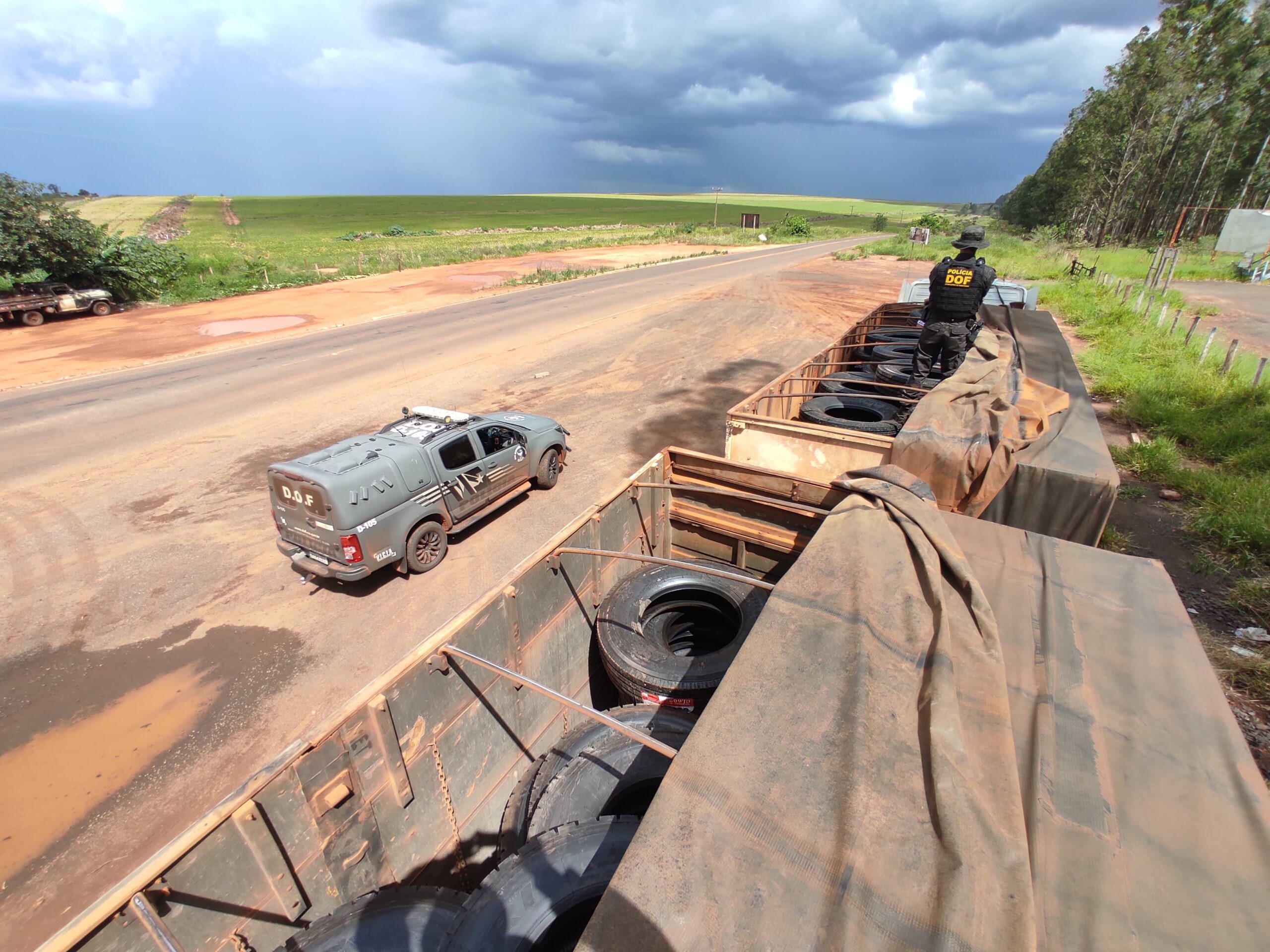 Uma carreta Mercedes-Benz acoplada a dois semirreboques foi apreendida pelo DOF (Departamento de Operações de Fronteira), com quase 170 pneus, na MS-164 em Ponta Porã. A apreensão aconteceu nesta terça-feira (05) e resultou na prisão de um homem de 45 anos de idade.