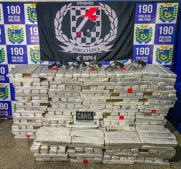 Neste sábado (18), uma ação da Equipe de Força Tática, com apoio da Equipe Canil do 4º Batalhão de Polícia Militar resultou na apreensão de aproximadamente 500 quilos de maconha e cinco armas de fogo em uma residência localizada no Bairro Jardim Primavera, em Ponta Porã.