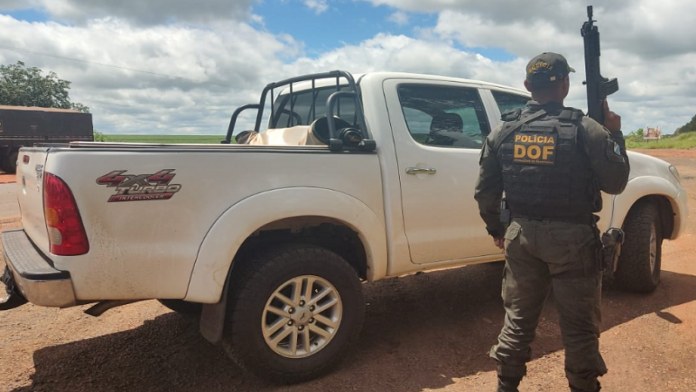 Policiais Militares do DOF (Departamento de Operações de Fronteira) apreenderam, na tarde desta quarta-feira (24), uma Toyota Hilux de cor branca com os sinais de identificação do motor diferentes do constante no documento do veículo.