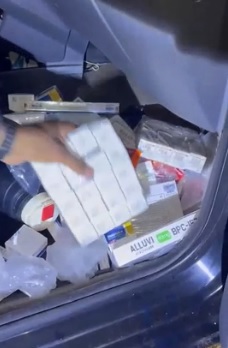 Durante vistoria no automóvel, foram encontradas 233 caixas e ampolas de medicamentos de origem estrangeira, sem documentação. Os produtos estavam escondidos no interior do veículo e incluíam substâncias usadas para emagrecimento e procedimentos estéticos.