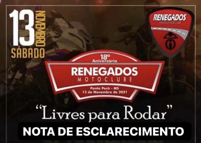 A diretoria do Renegados Moto Clube da Fronteira, que realizou no último final de semana em Ponta Porã, a comemoração do seu 18° aniversário com o evento “Livres Para Rodar”, no estacionamento do Parque dos Ervais, se pronunciou em uma nota divulgada nas redes sociais nas primeiras horas desta Segunda-Feira (15), a respeito das confusões generalizadas que ocorreram no centro da cidade e que rapidamente viralizaram na internet.