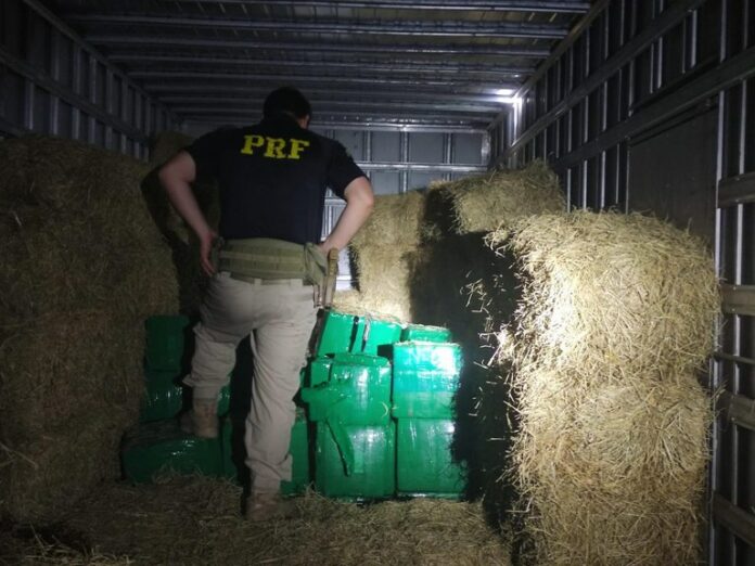 Os policiais fiscalizavam na BR-267, quando abordaram um caminhão. Durante a fiscalização, o motorista disse que transportava fardos de feno, mas durante a fiscalização, os policiais encontraram grande quantidade de maconha escondida na carga de feno.