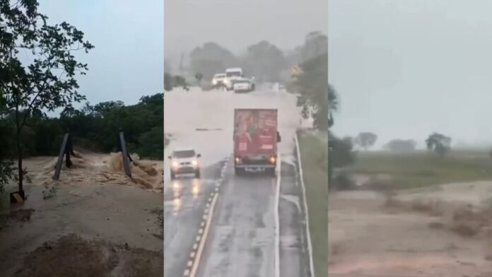 Motoristas e moradores estão sendo alertados para evitar travessias em áreas alagadas e pontes, e procurar rotas alternativas. Imagens mostram a força da água e carros ilhados em rodovias.