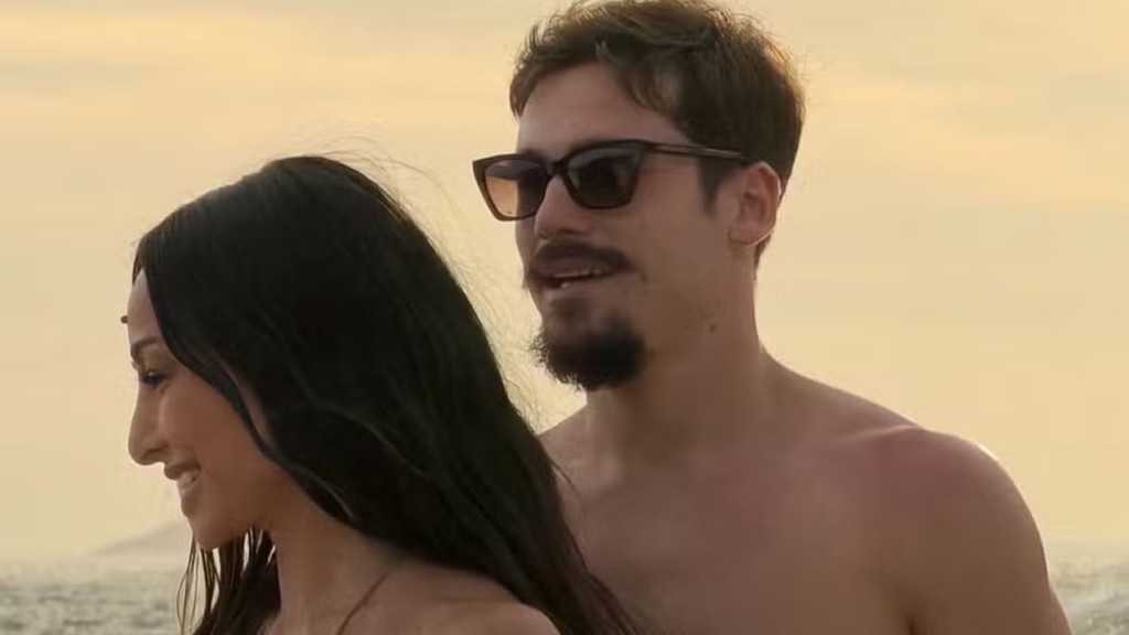Para o passeio, Sabrina escolheu um biquíni fio-dental nude de crochê, enquanto Nicolas exibia seu shape em um short e sem camisa.