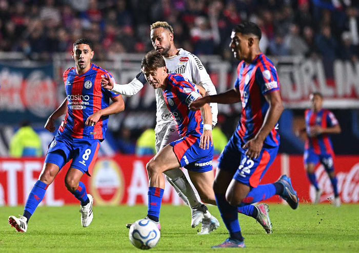 Em 13 minutos de jogo, o goleiro Gabriel Brazão já havia feito duas defesas incríveis, sendo uma em cima da linha e garantindo que o placar continuasse no zero. No entanto, aos 26 minutos, um vacilo de Willian Arão no meio-campo resultou em gol de Cuello. O Santos, então, reagiu em cinco minutos e melhorou depois do gol sofrido. Aos 32, Rollheiser, o principal destaque alvinegro do primeiro tempo, encontrou Neymar avançando pela esquerda. O camisa 10 invadiu a área e devolvou para o argentino, que ajeitou de para Gabigol chegar finalizando. Tudo igual: 1 a 1.
