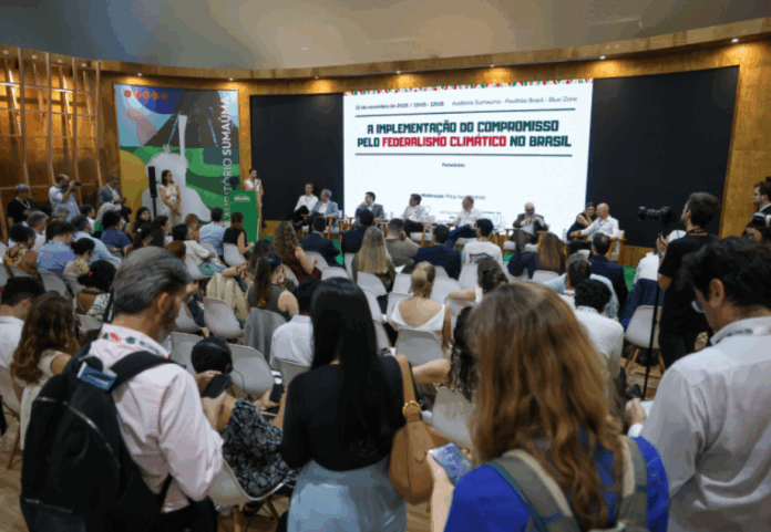 O modelo de federalismo climático brasileiro voltou à pauta de debates na última quarta-feira (12/11) na COP30, durante o painel “A implementação do Compromisso pelo Federalismo Climático no Brasil”. Promovida pela Secretaria de Relações Institucionais da Presidência da Presidência da República na Zona Azul, o evento fechou questão em um ponto: não haverá implementação das medidas de combate às mudanças do clima sem participação efetiva de municípios e estados.