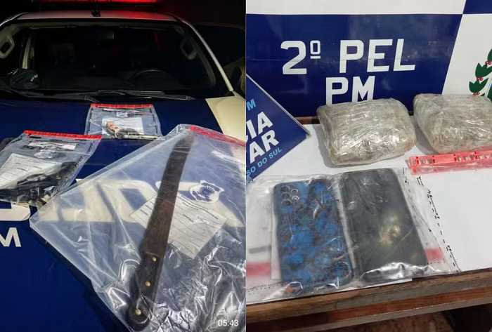 Na ação, foram apreendidos dois revólveres, um facão, porções de droga do tipo skunk e celulares.