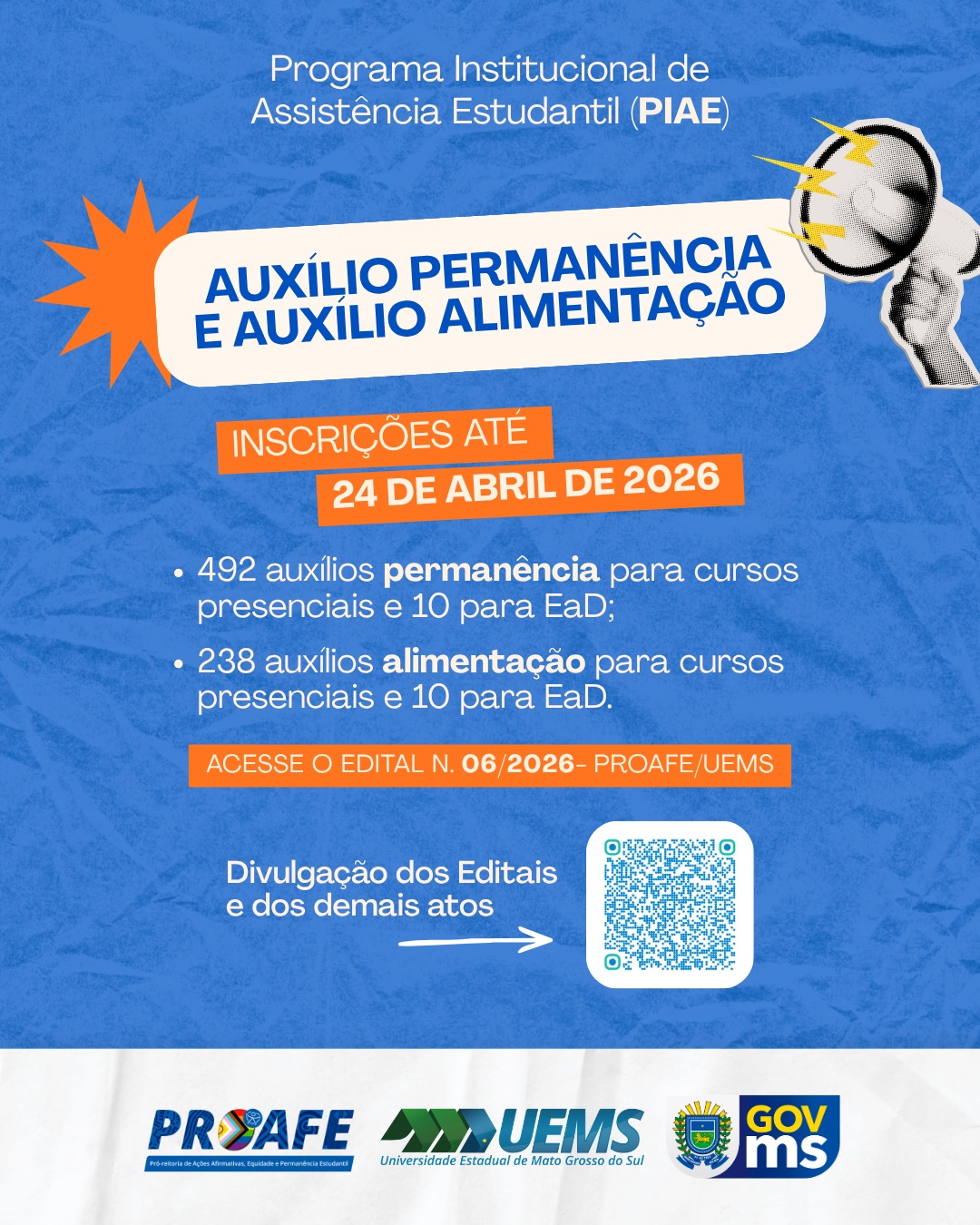 A Universidade Estadual de Mato Grosso do Sul (UEMS) abriu inscrições para o processo de avaliação socioeconômica que possibilita o acesso aos auxílios permanência e alimentação. A iniciativa integra o Programa Institucional de Assistência Estudantil (PIAE) e tem vigência prevista entre maio de 2026 e maio de 2027.
